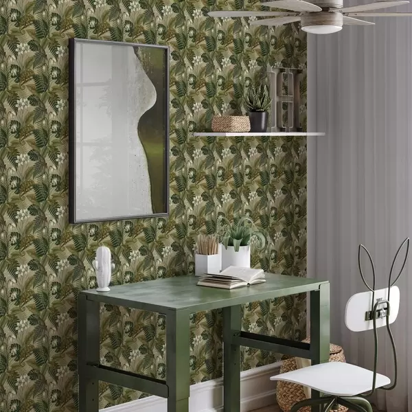 Тапет Хамелеони и тропически листа, бели цветя, бежова основа Nr. a00608