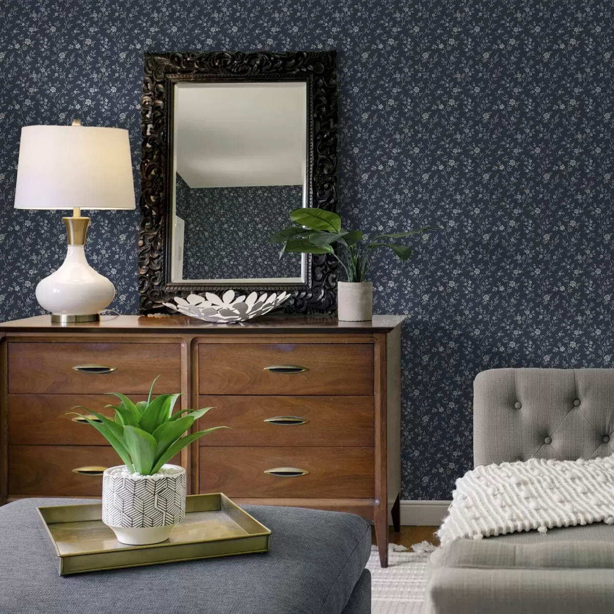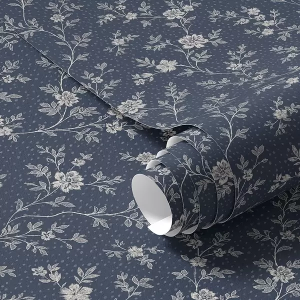 Тапет Тъмно син фон с тънки бежови клонки и цветя Nr. a00612
