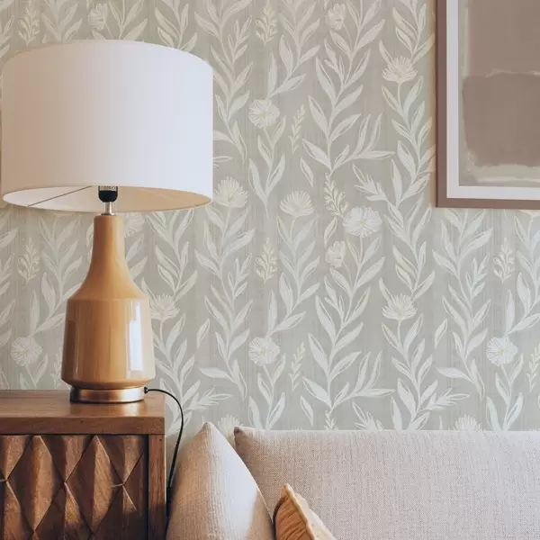 Тапет Светли треви и цветя върху бежови, схематични линии Nr. a00618
