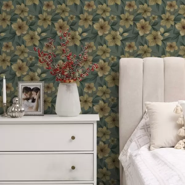 Тапет Охрени цветя на тъмнозелен фон, гъст мотив Nr. a00628