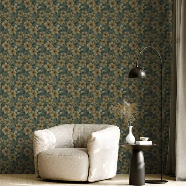 Тапет Охрени цветя на тъмнозелен фон, гъст мотив Nr. a00628