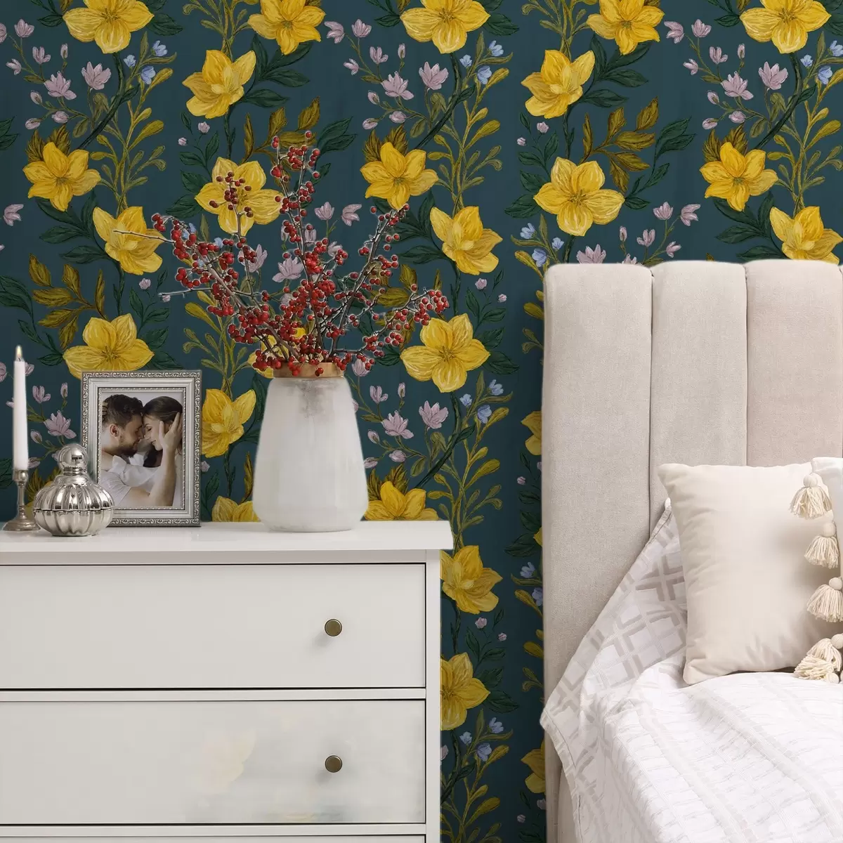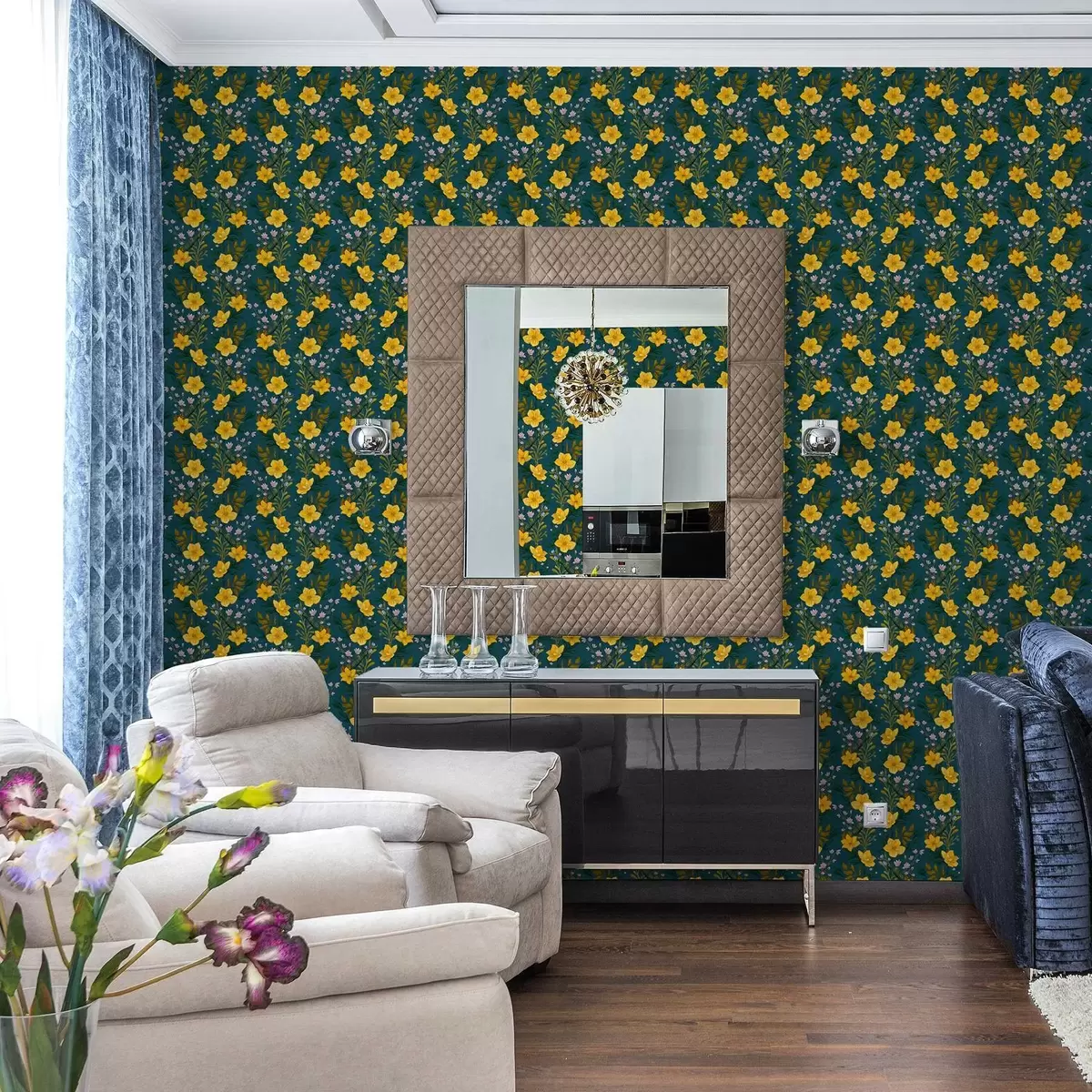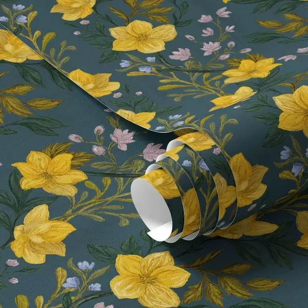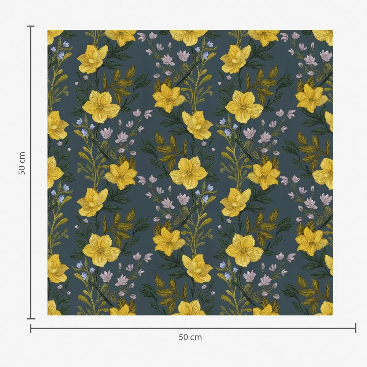Тапет Жълти цветя във вертикални гирлянди на тъмно син фон Nr. a00632v2