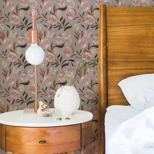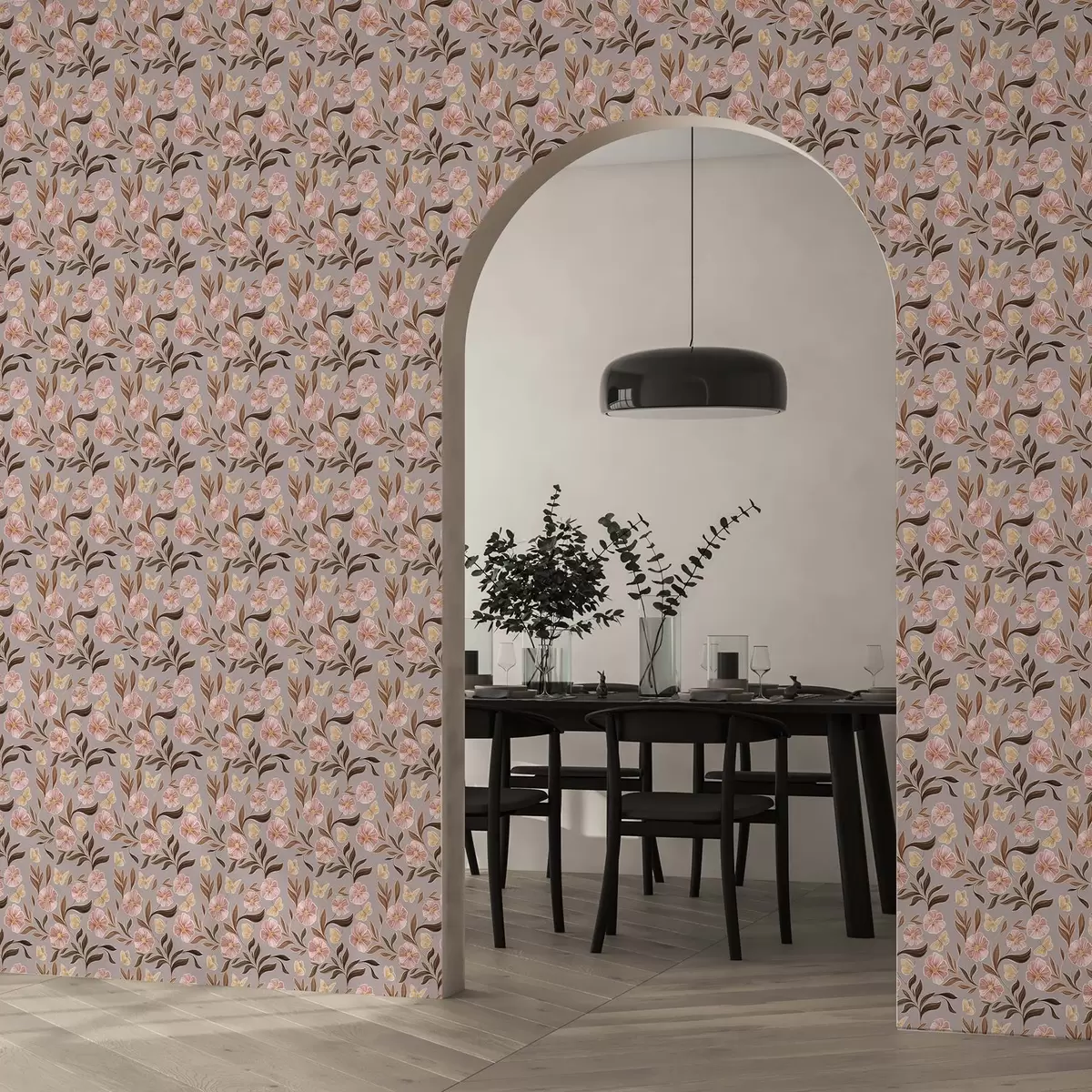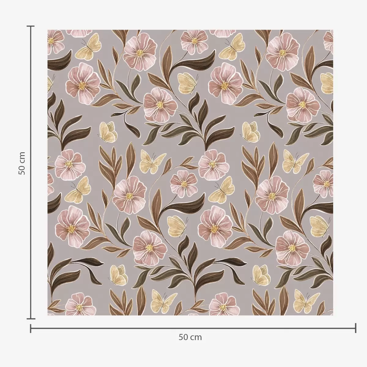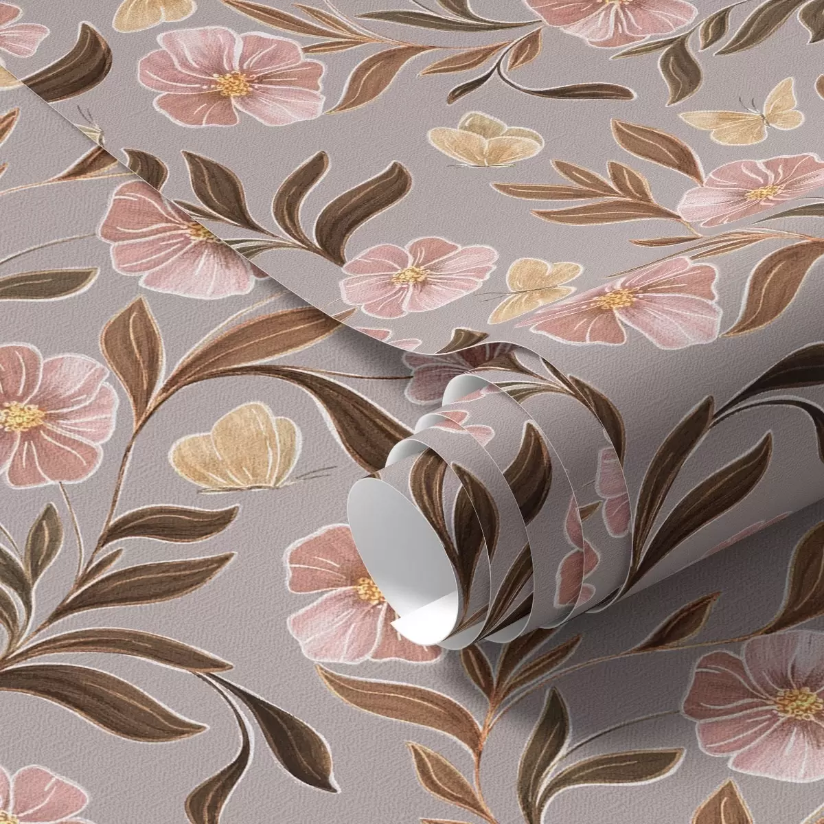 Тапет Розови цветя и пеперуди на сиво-бежов фон Nr. a00633