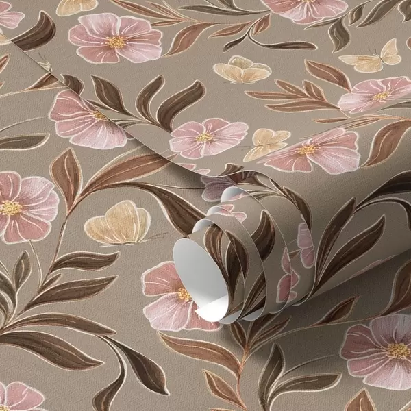 Тапет Розови цветя и пеперуди на маслинено-бежов фон Nr. a00633v2