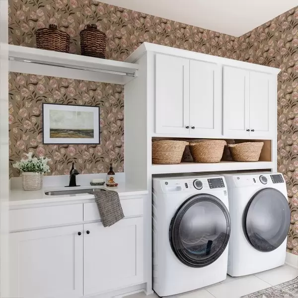 Тапет Розови цветя и пеперуди на маслинено-бежов фон Nr. a00633v2