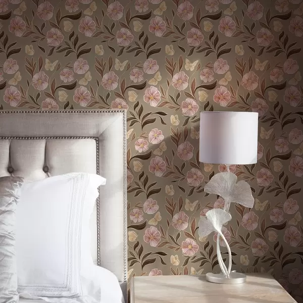 Тапет Розови цветя и пеперуди на маслинено-бежов фон Nr. a00633v2
