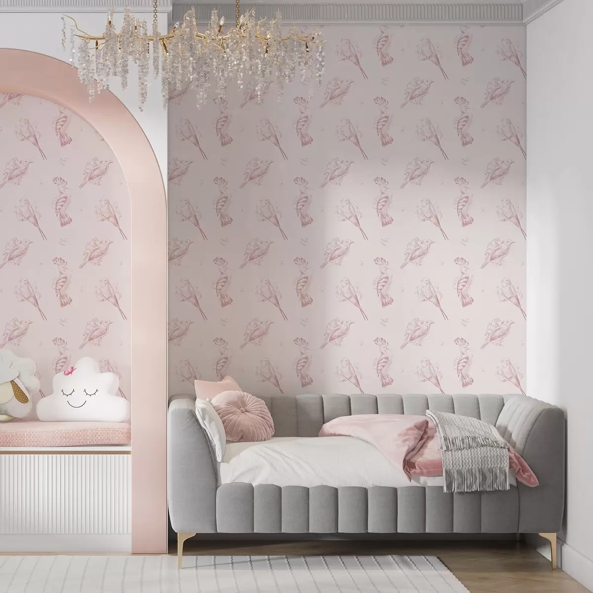 Тапет Птичи тоалет: скицирани птици, нежно розов фон Nr. a00656