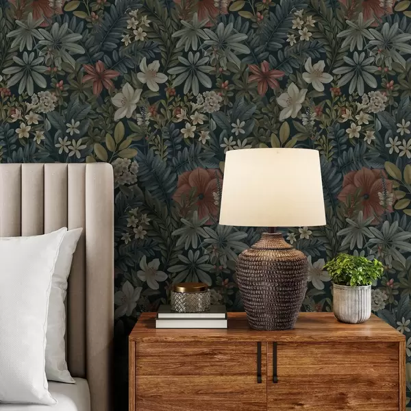 Тапет Тъмно фоново изображение с гъсти цветя и листа в топли тонове Nr. a00678