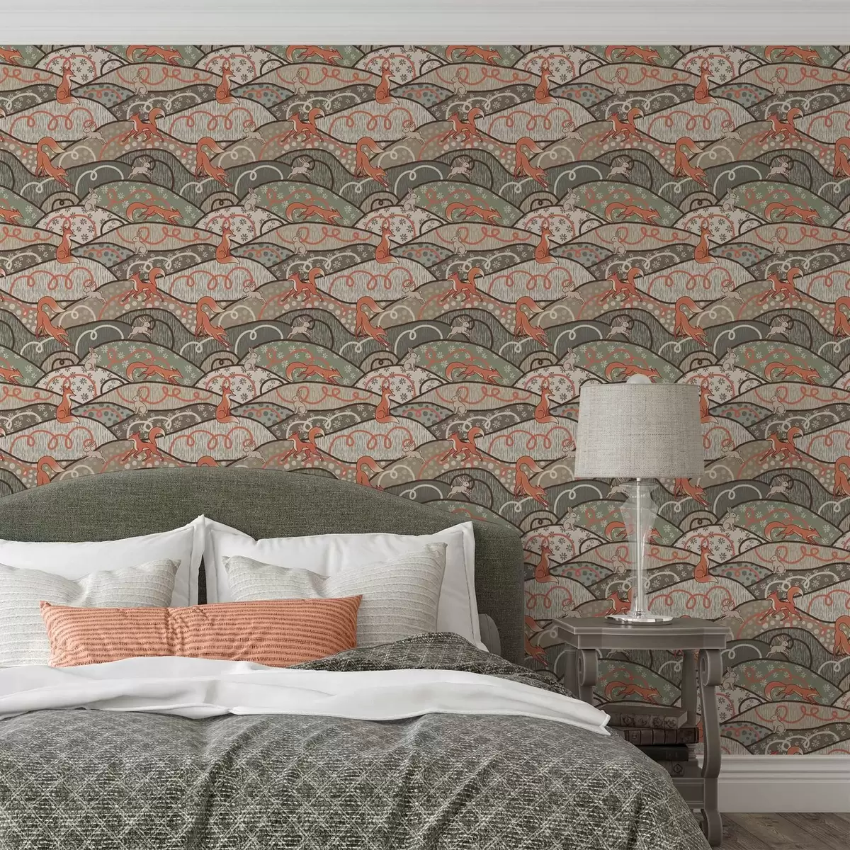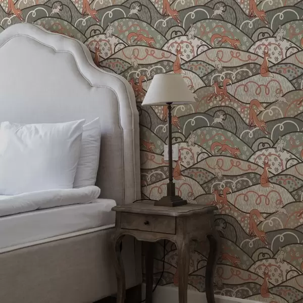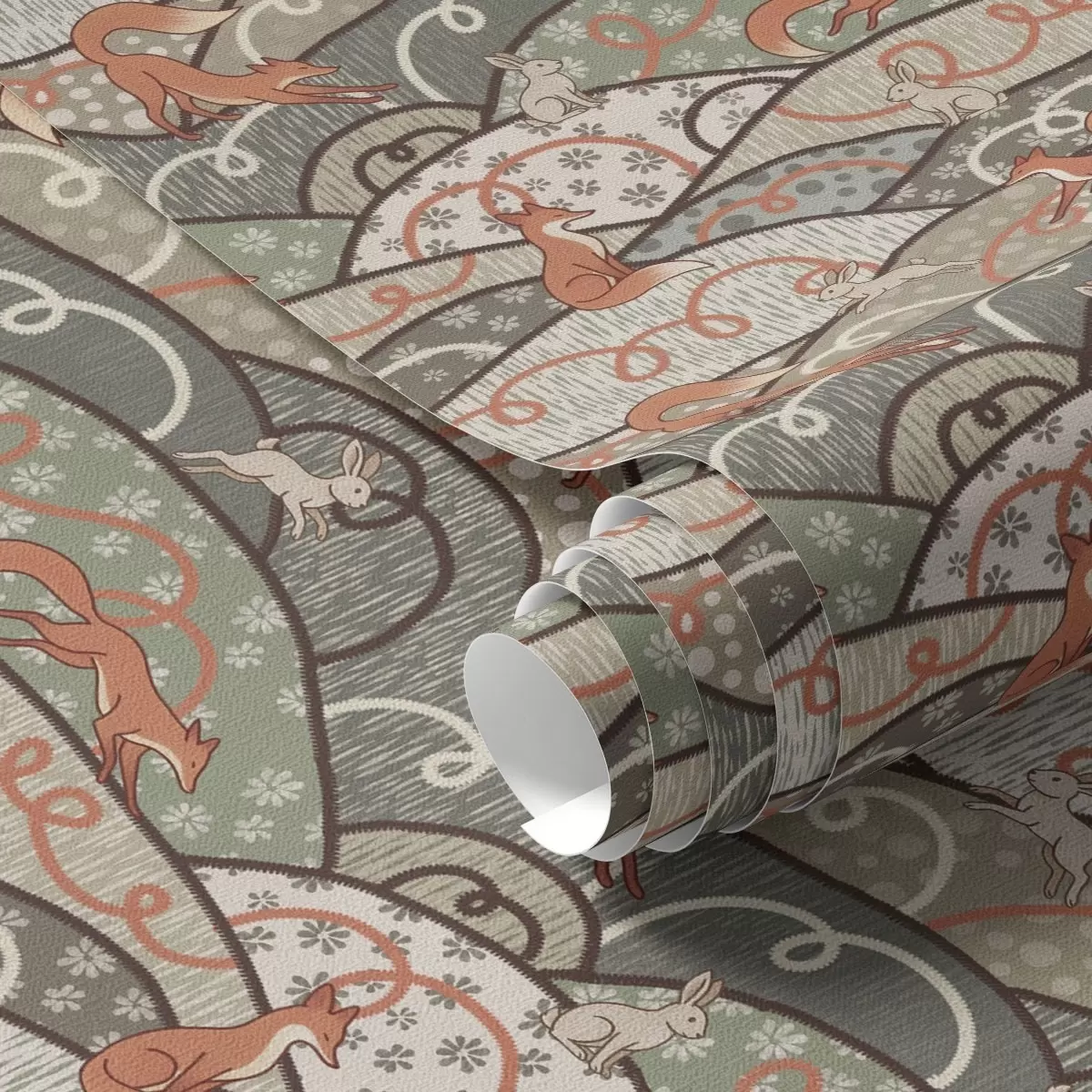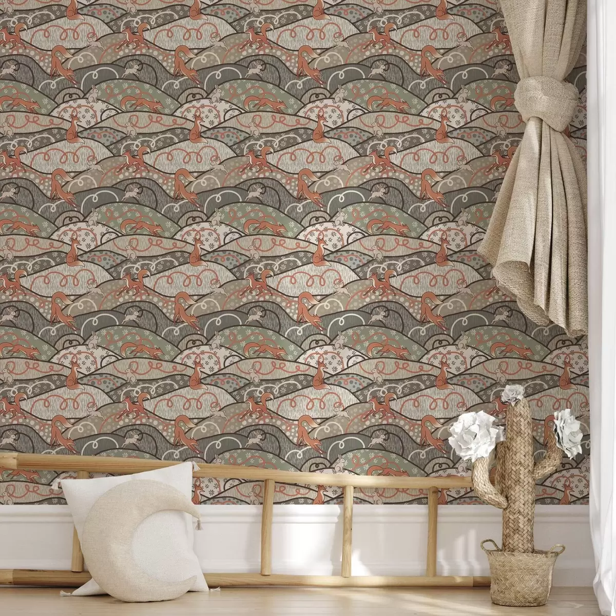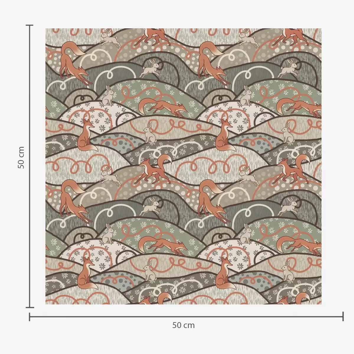 Тапет Лисици и зайци на вълнообразни хълмове, ретро мотив Nr. a00690