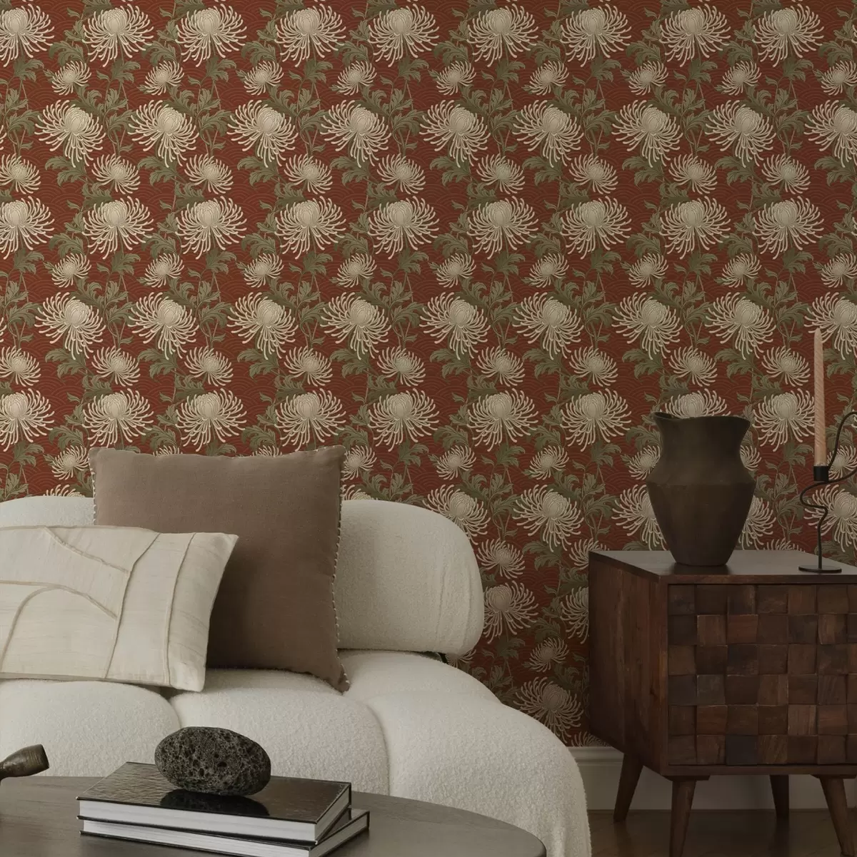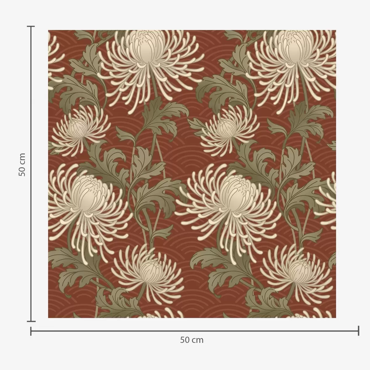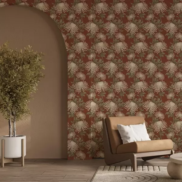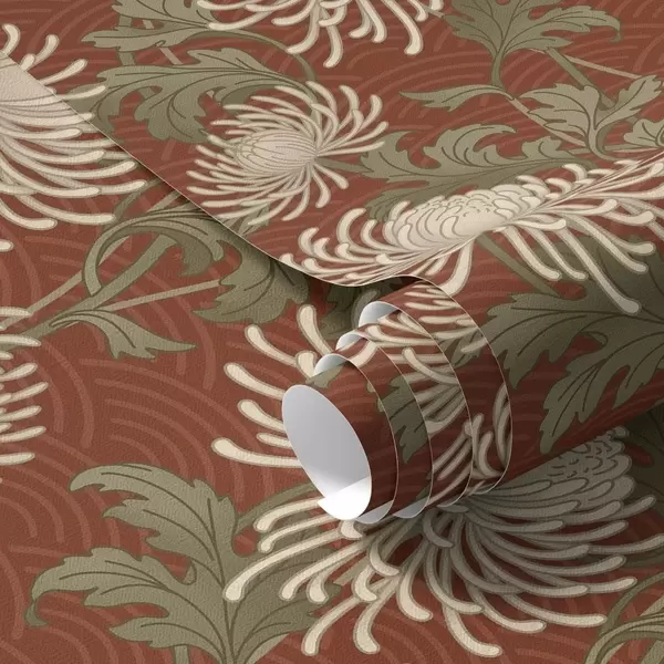 Тапет Кремави хризантеми на теракотен фон, в азиатски стил Nr. a00693