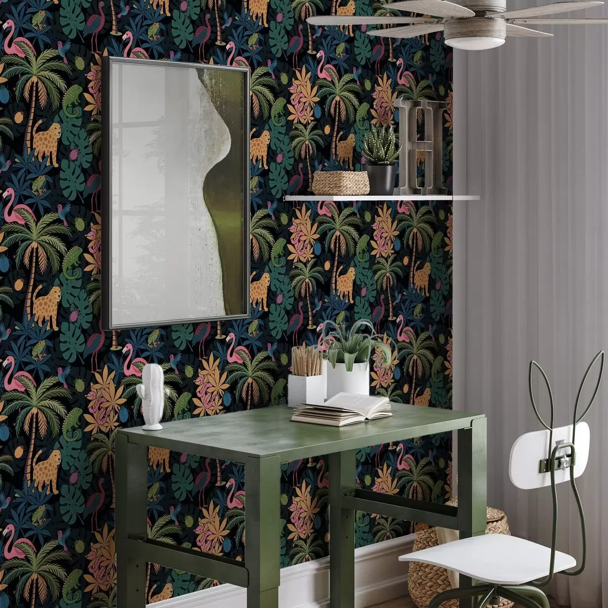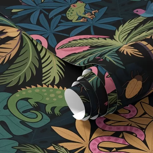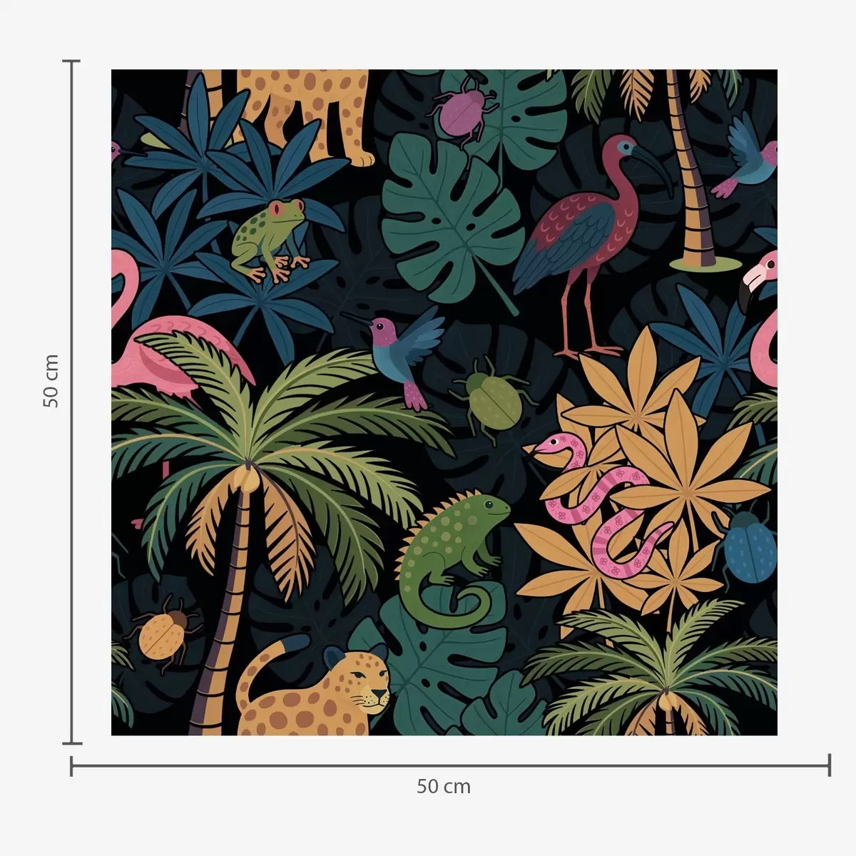 Тапет Ярки тропически животни сред листата на тъмен фон Nr. a00701