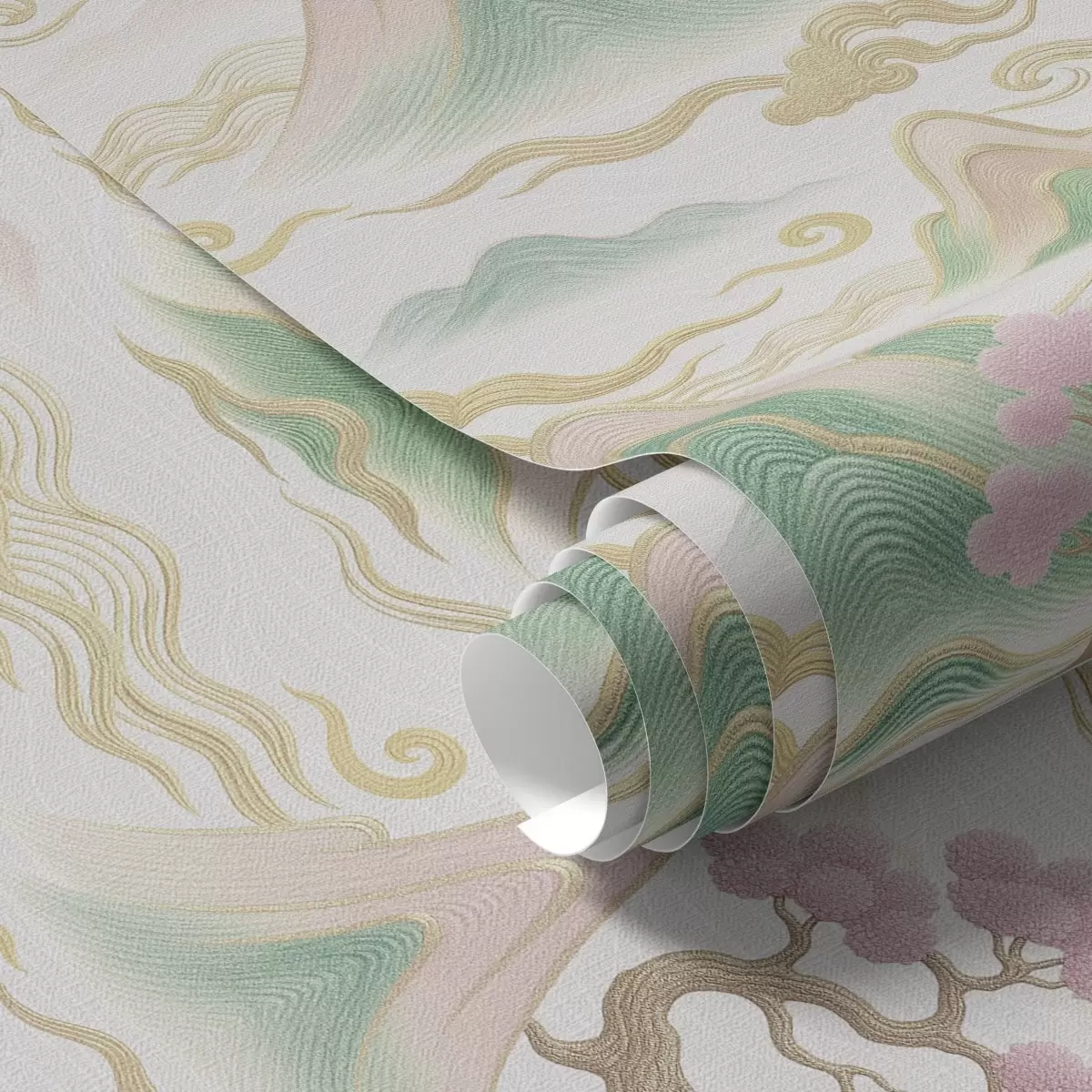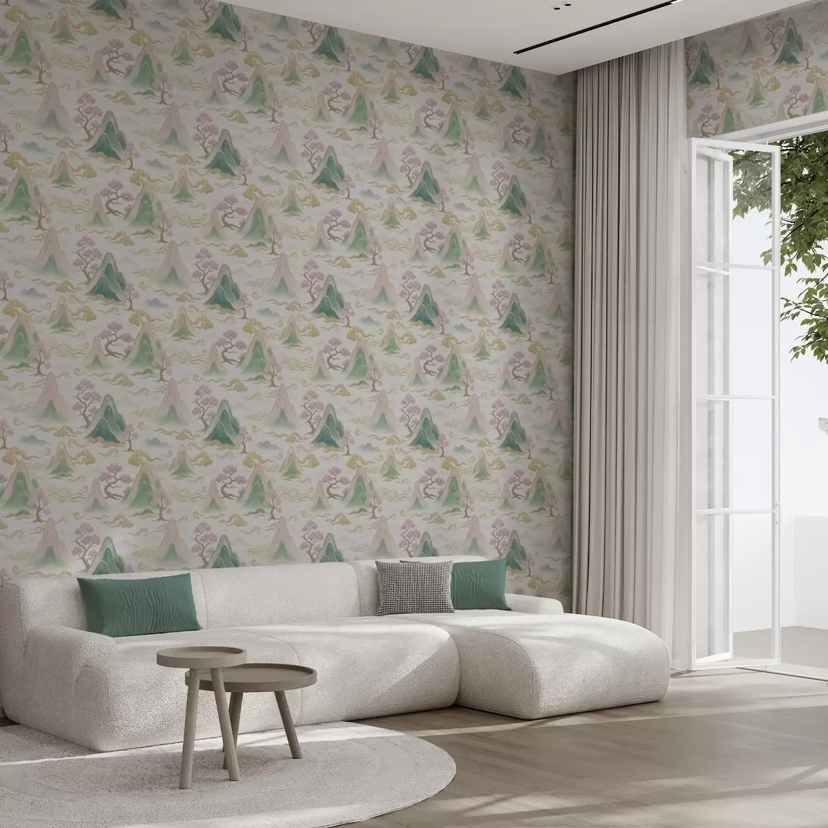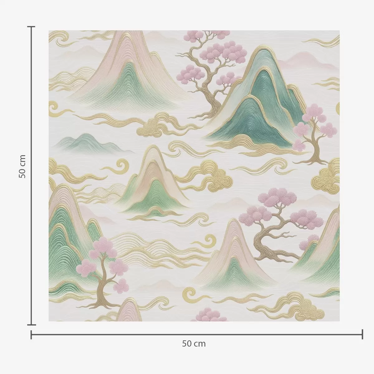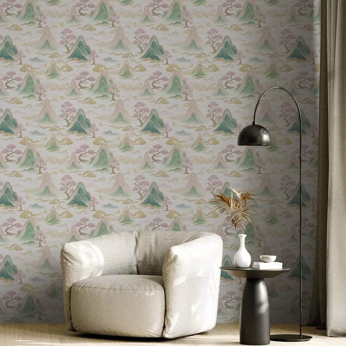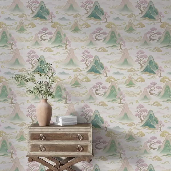 Тапет Планини, облаци и борове в ориенталски декоративен стил Nr. a00703