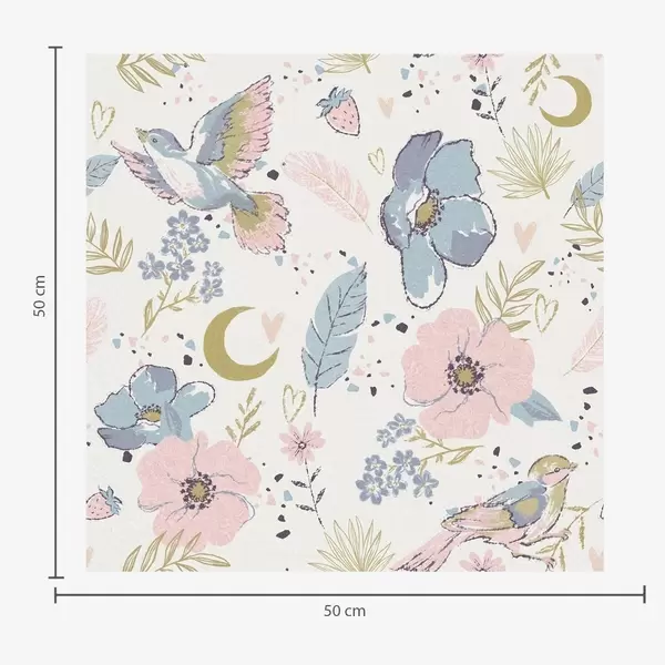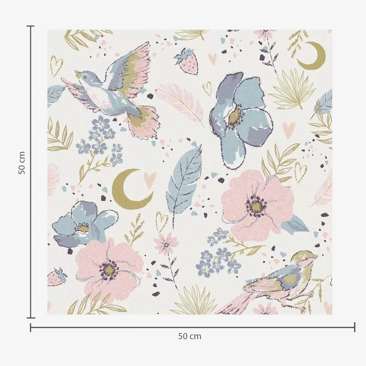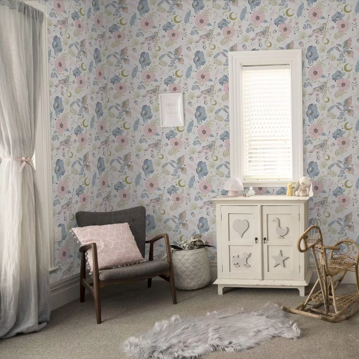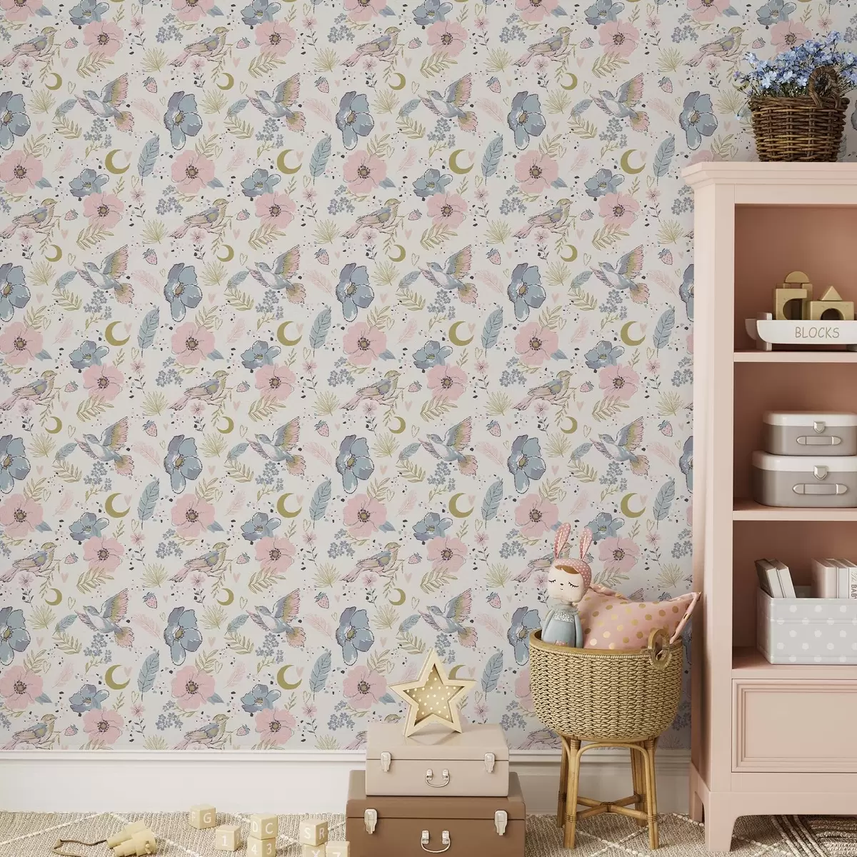 Тапет Пастелни птици и цветя с полумесеци на бял фон Nr. a00721