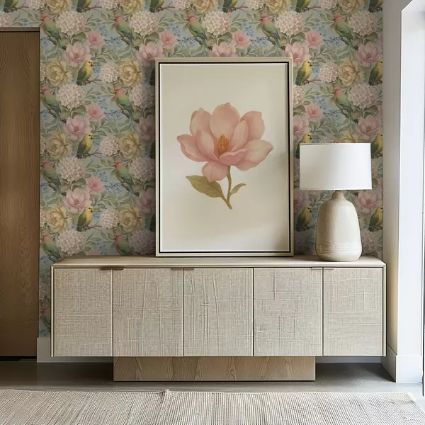 Тапет Папагали сред божури, хортензии и магнолии Nr. a00747