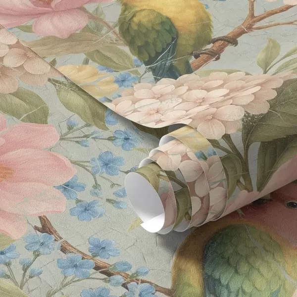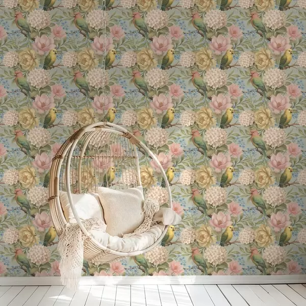 Тапет Папагали сред божури, хортензии и магнолии Nr. a00747