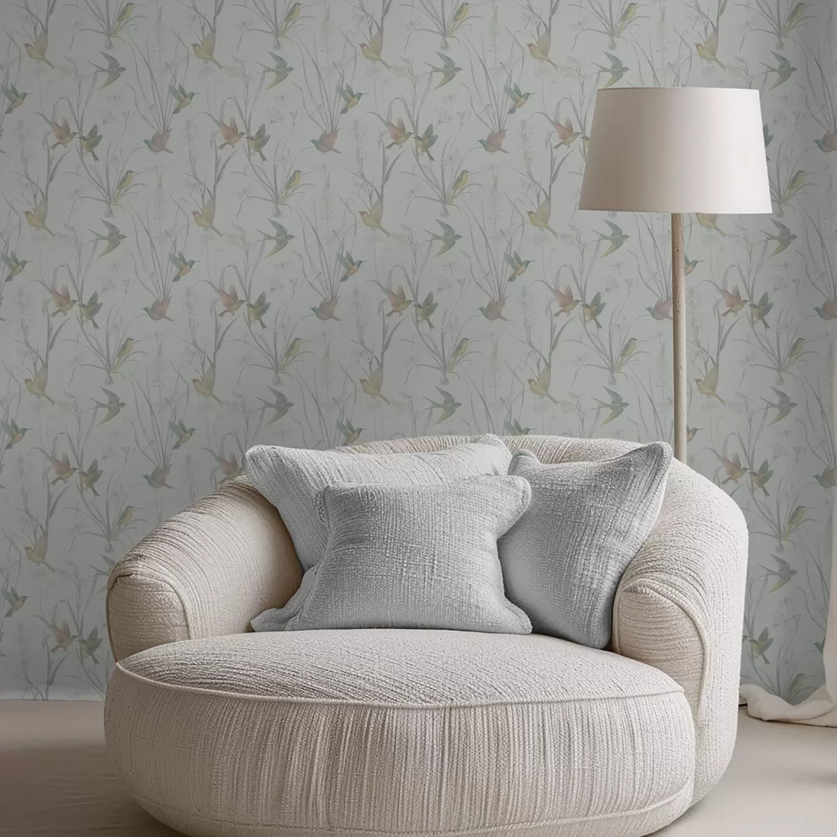 Тапет Птици сред тревите на поляната на светлосиво фоново Nr. a00776v1