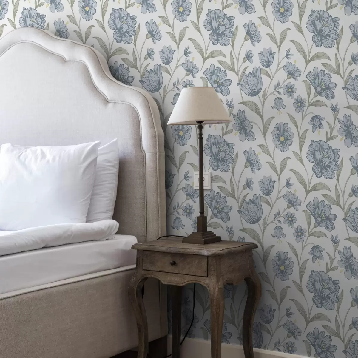 Тапет Прахни сини цветя с маслинови листа на бял фон Nr. a00780