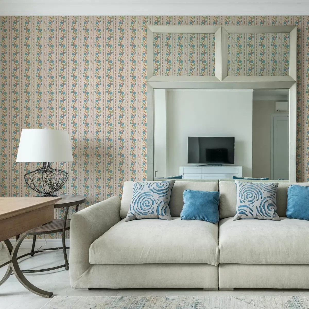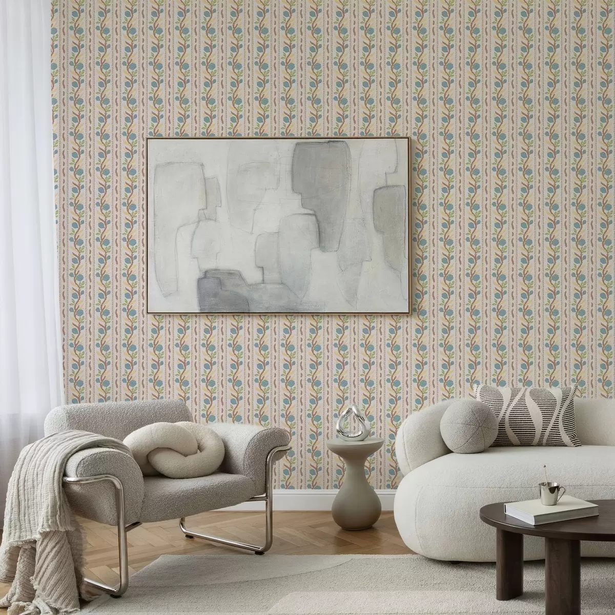 Тапет Вертикални ленти с букет от сини цветя на топъл фон Nr. a00816v3