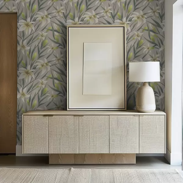 Тапети Кремави лилии с листа на сиво-бежов фон a00837