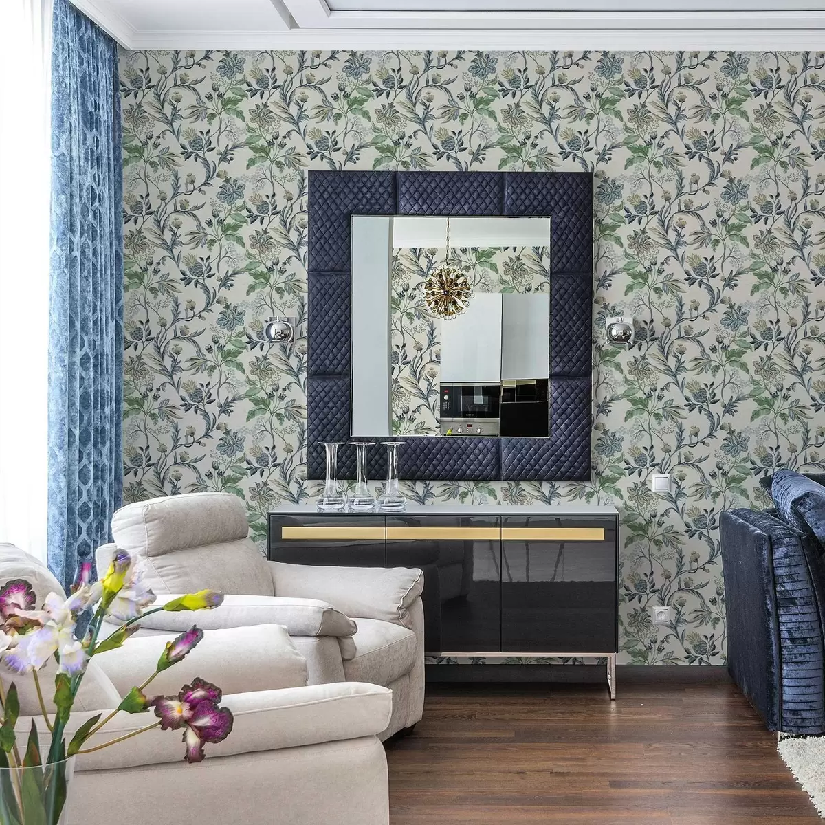 Тапет Синьо-зелени народни цветя и листа върху кремаво Nr. a00863