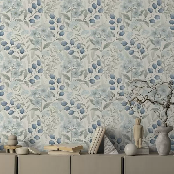 Тапет Сини плодове и светли цветя върху слонова кост Nr. a00872