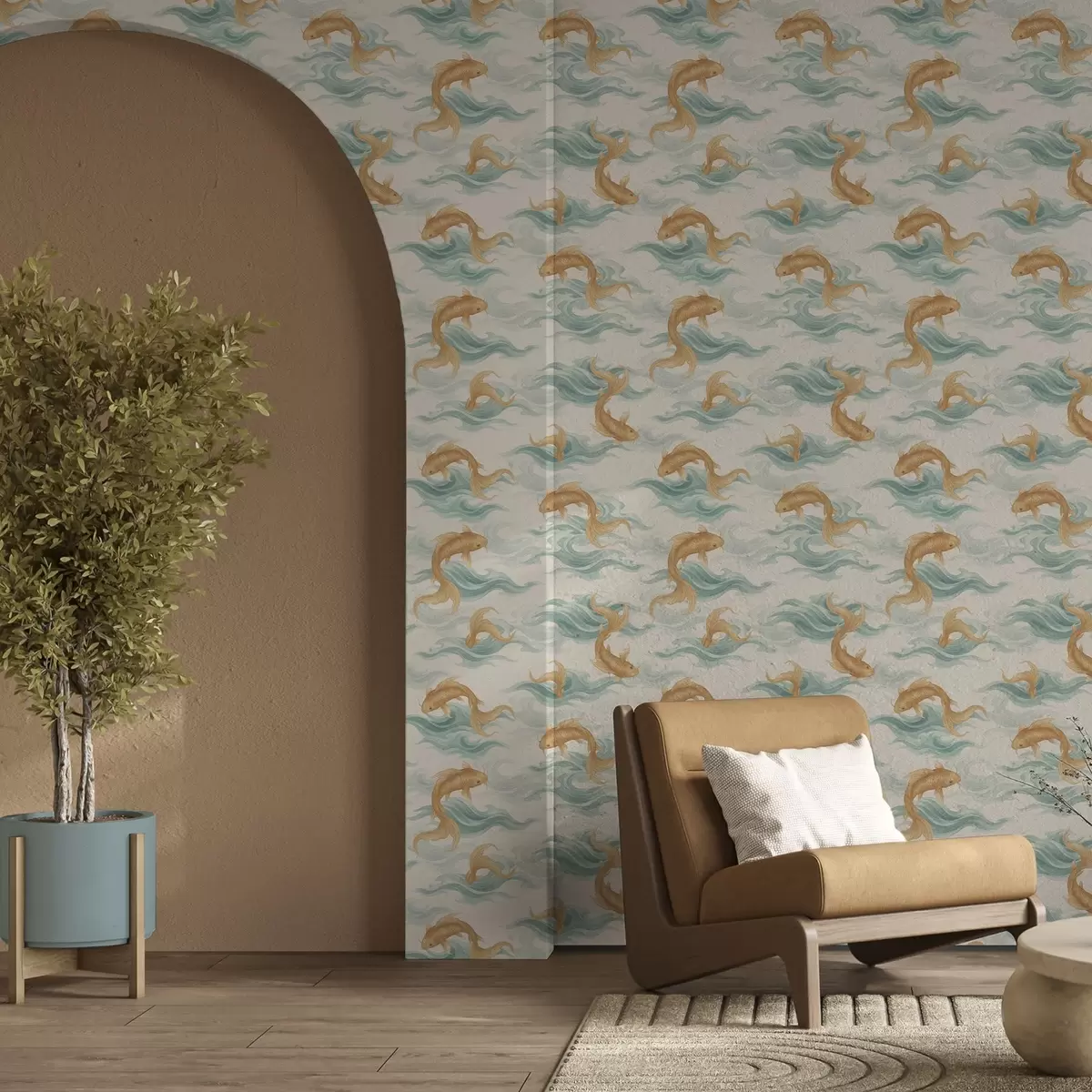 Тапет Кехлибарена кои риба, плуваща сред меки тюркоазени вълни Nr. a00894