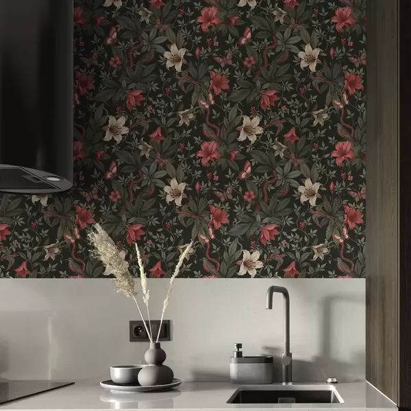 Тапет Тъмни джунглеви цветя с птици и пеперуди Nr. a00895