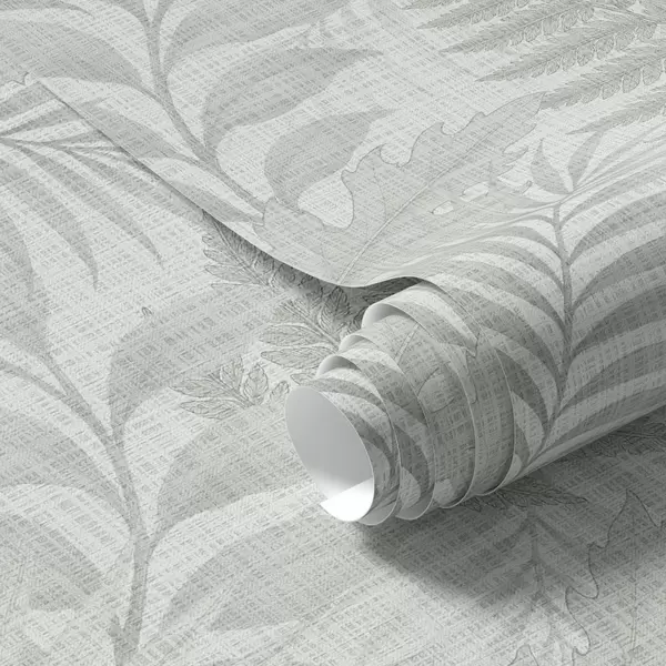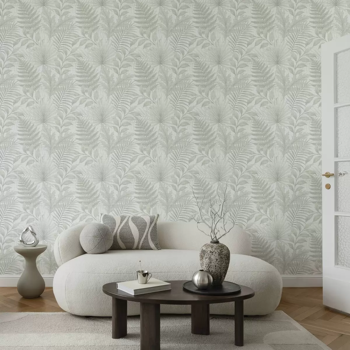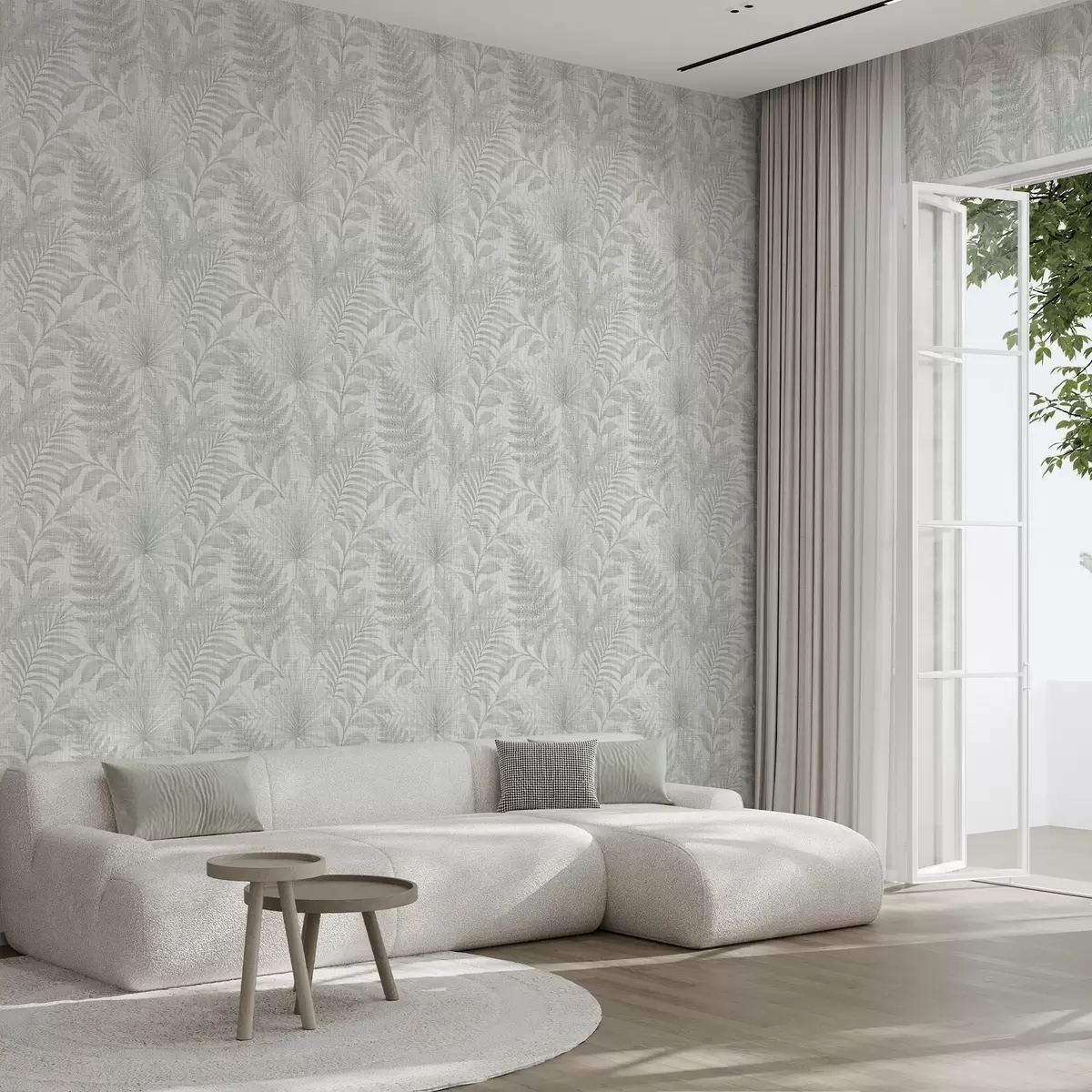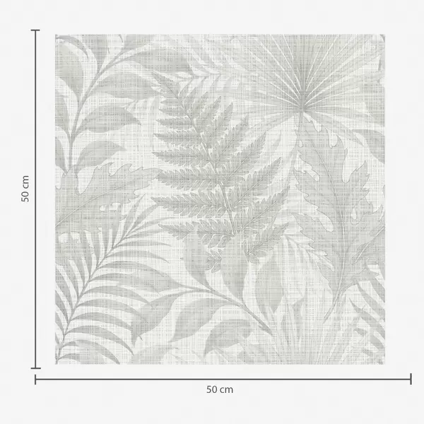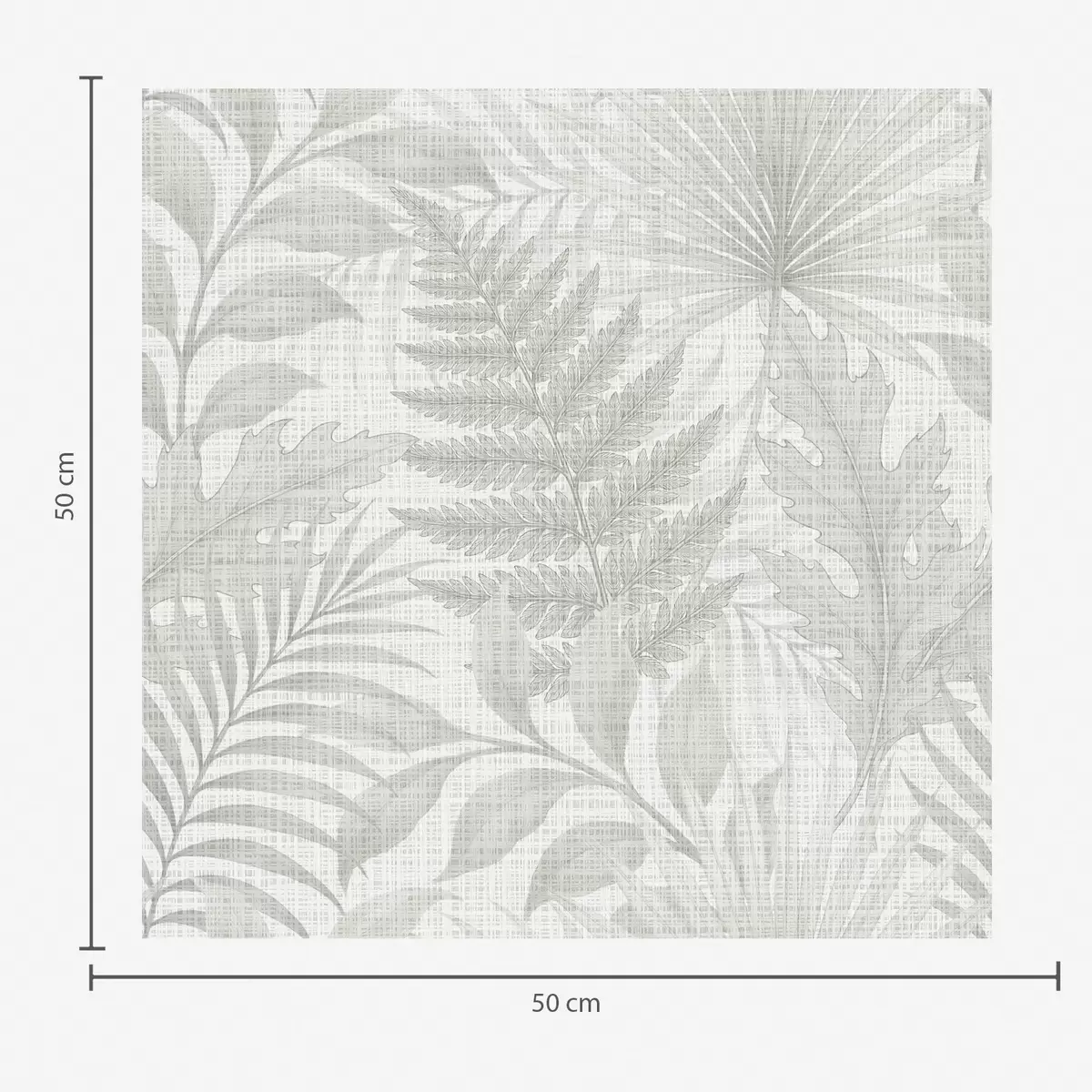 Тапет Меки тропически листа в бледо сиво върху ленена текстура Nr. a00899