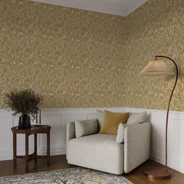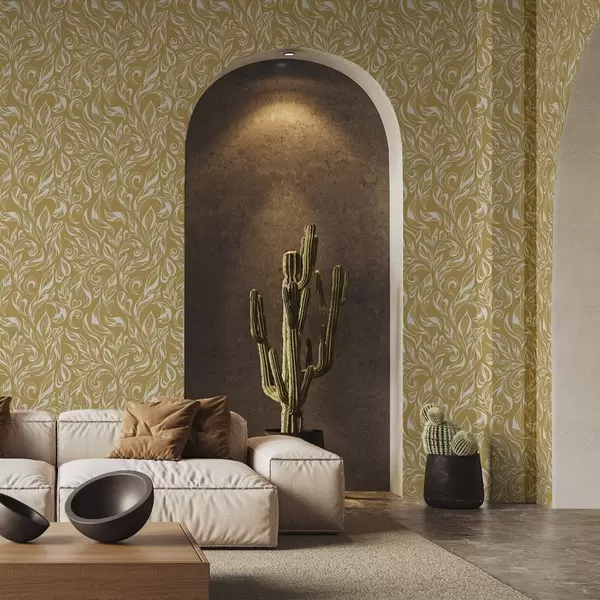 Тапет Кремаво-бял листен орнамент на топъл охрен фон Nr. a00940v1