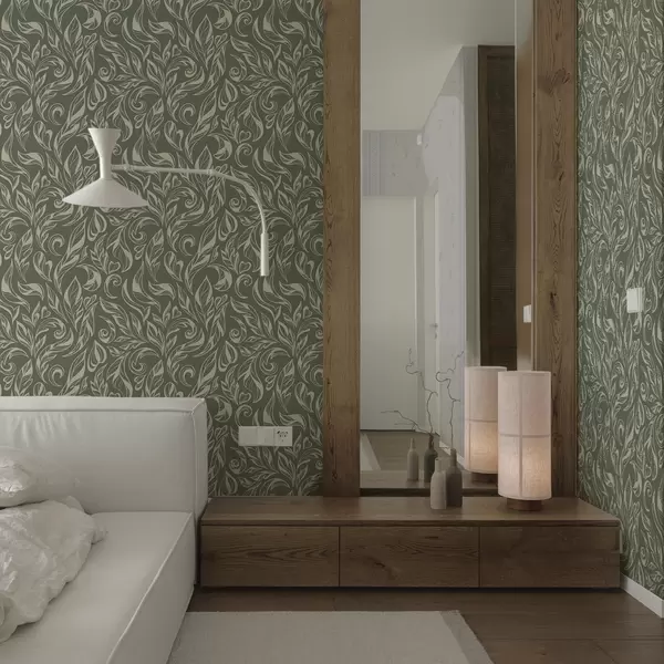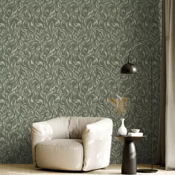 Тапет Кремаво листно орнамент върху зеленикаво-сив фон Nr. a00940v2