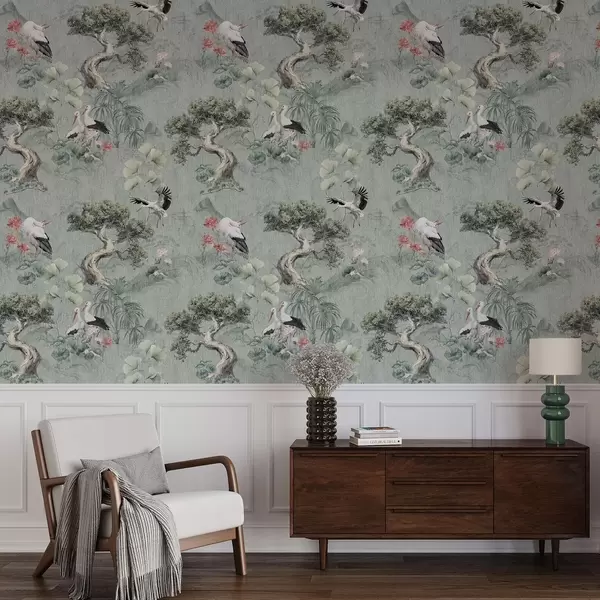 Тапет Журавли сред борове и лотоси на спокоен зелен фон Nr. a00962