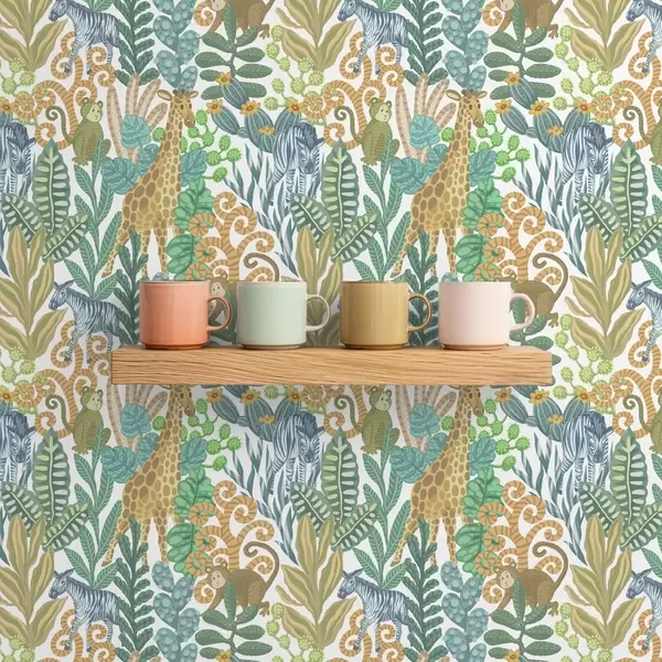 Тапет Весели животни от саваната сред листа на бял фон Nr. a01000