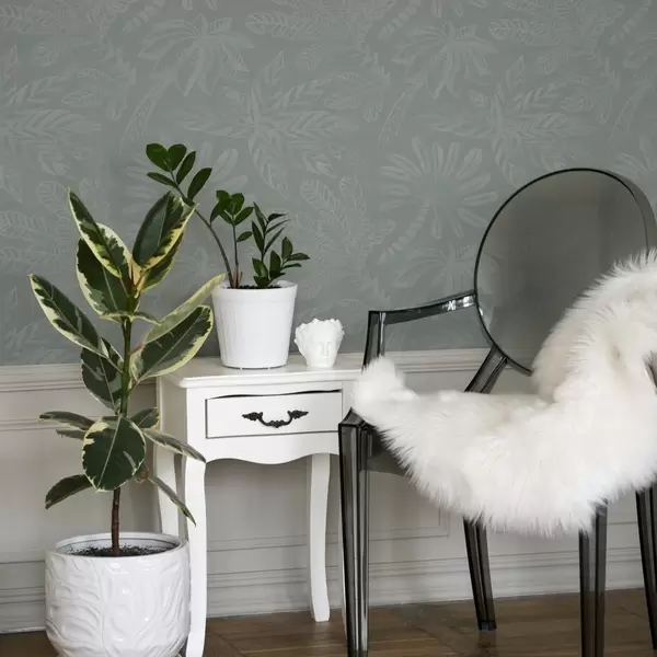 Тапет Матови големи тропически листа в ментово-сива палитра Nr. a01001
