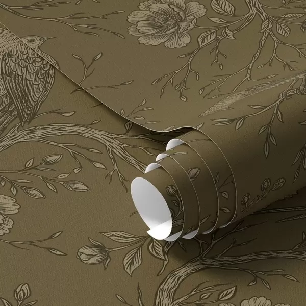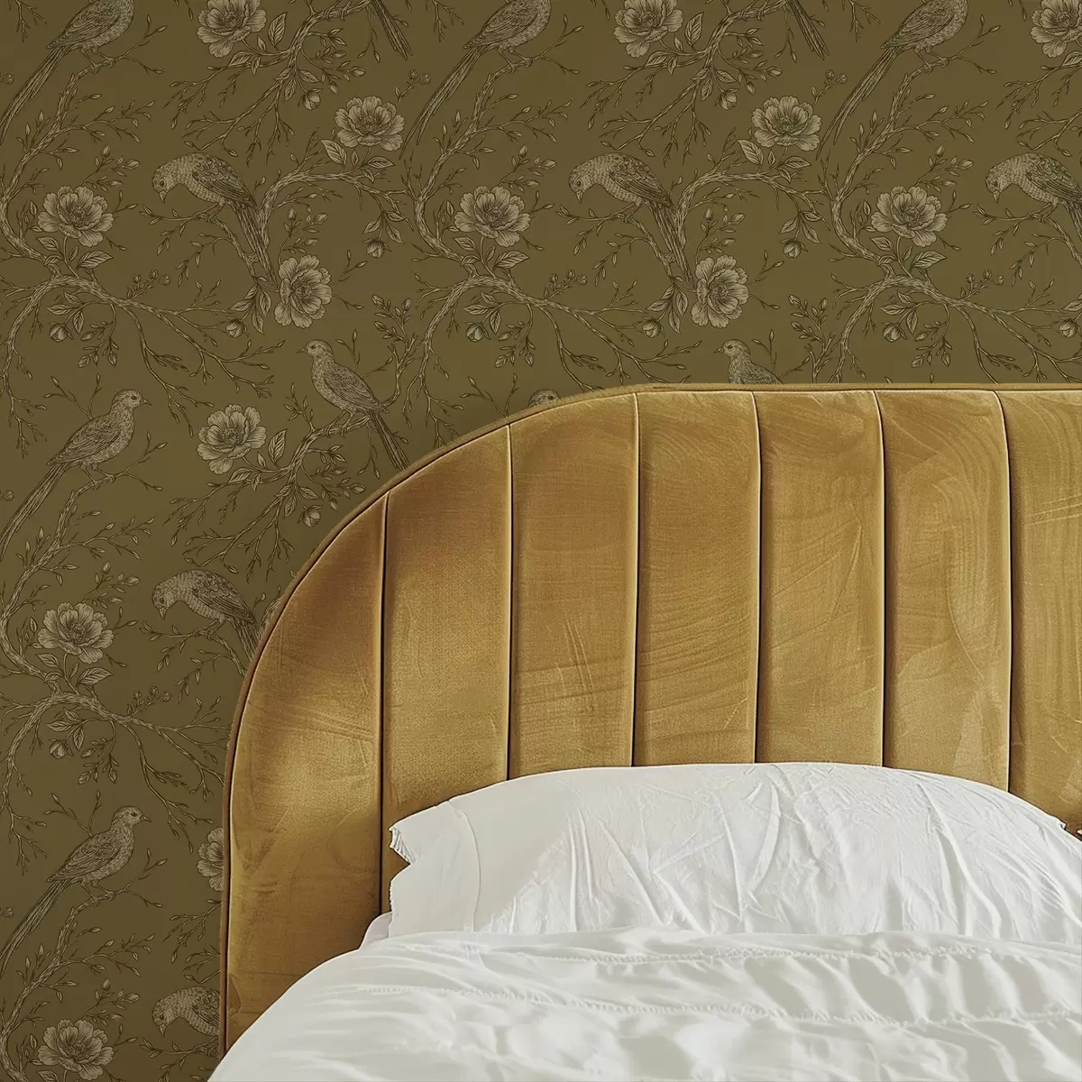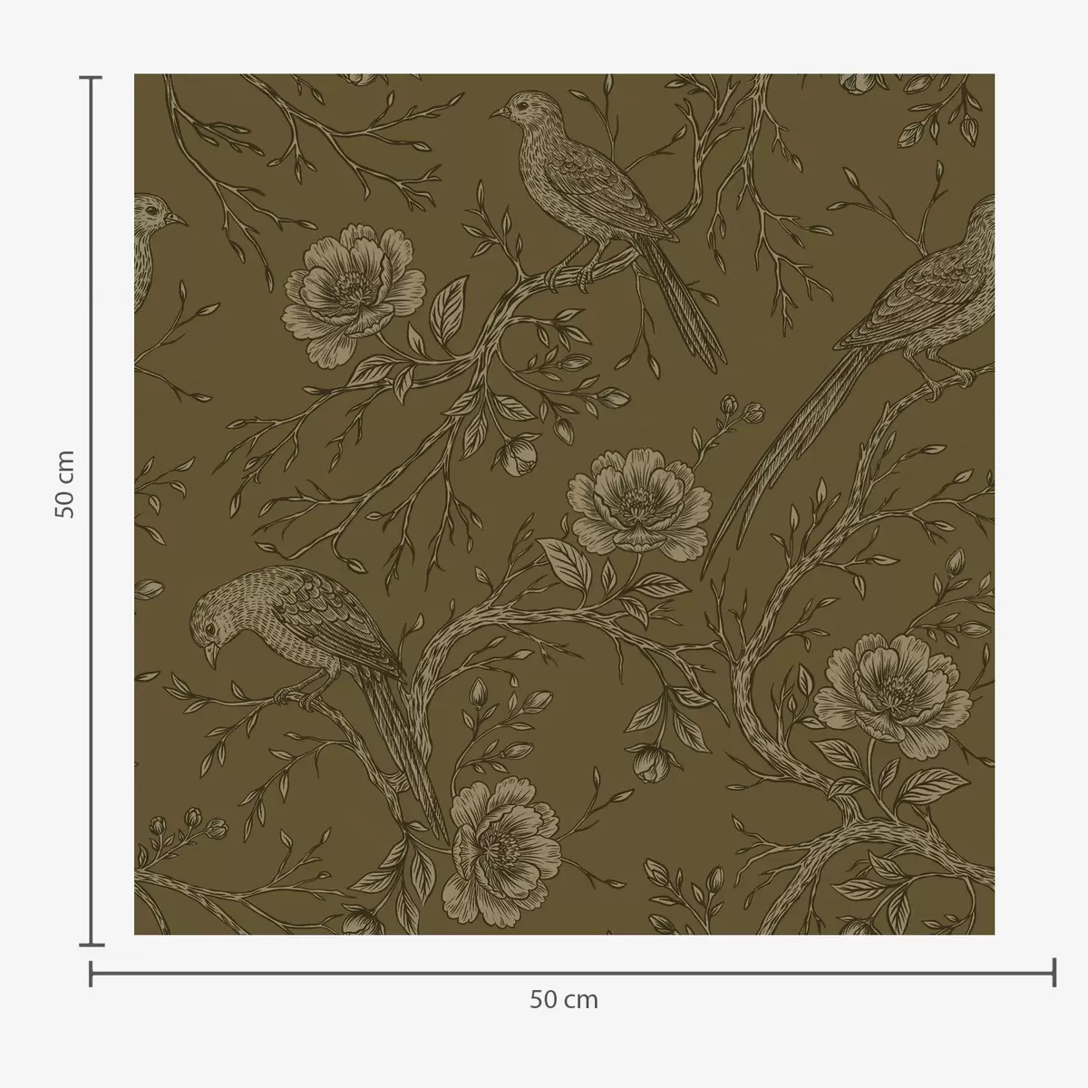 Тапет Ретро птици и цветя на топъл маслинов фон Nr. a01022v1