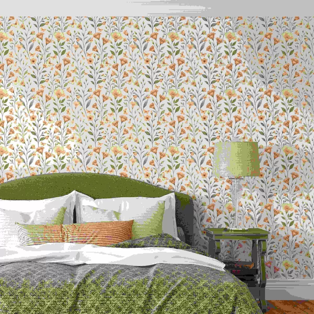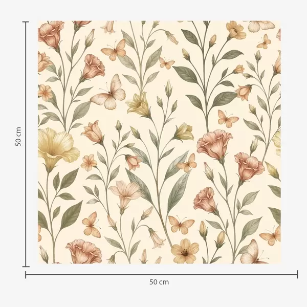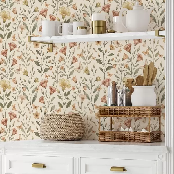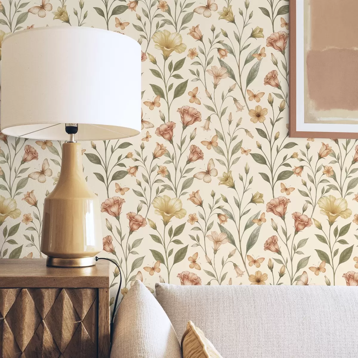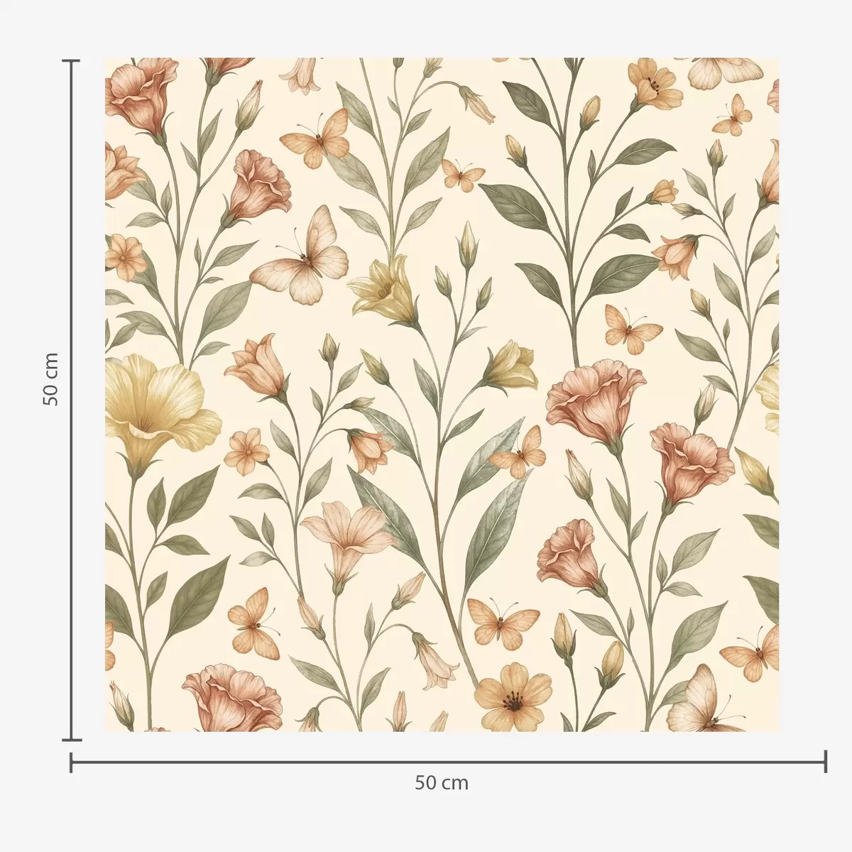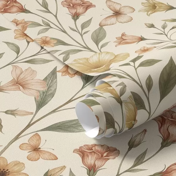 Тапет Нежни прасковени цветя и пеперуди на топъл кремав фон Nr. a01026