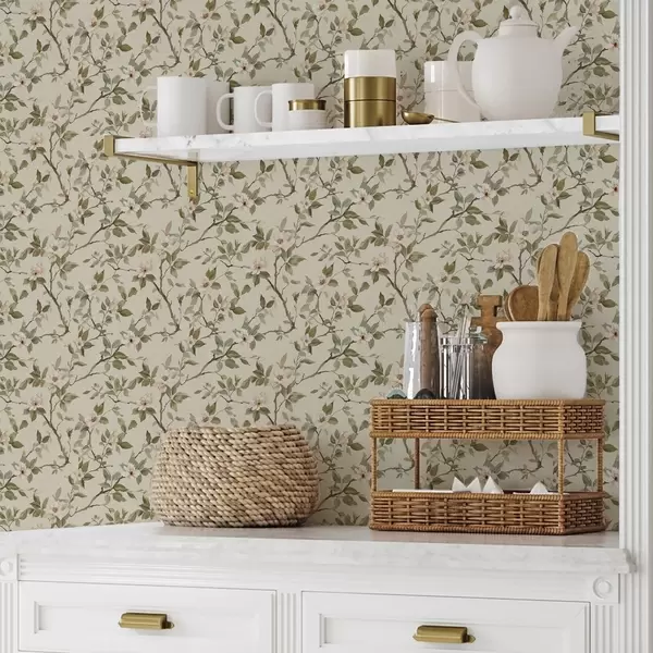 Тапет Леки клонки с малки кремави цветя и зелени листа Nr. a01028