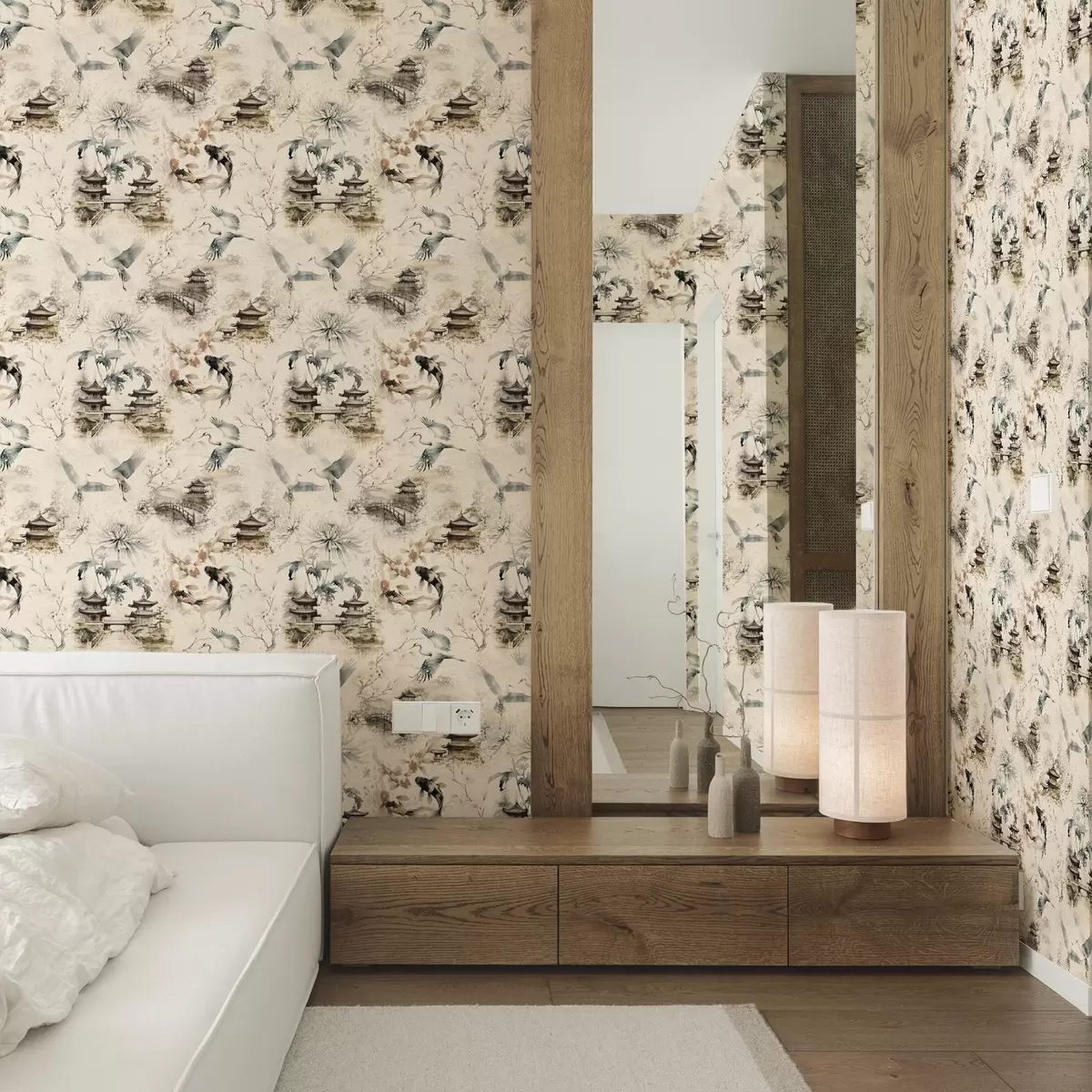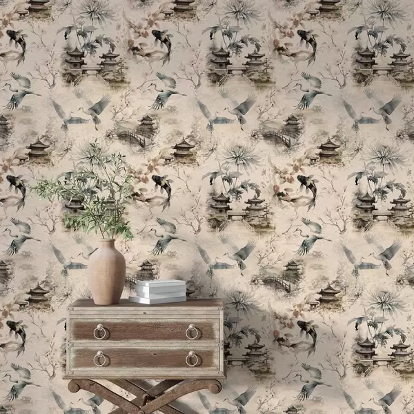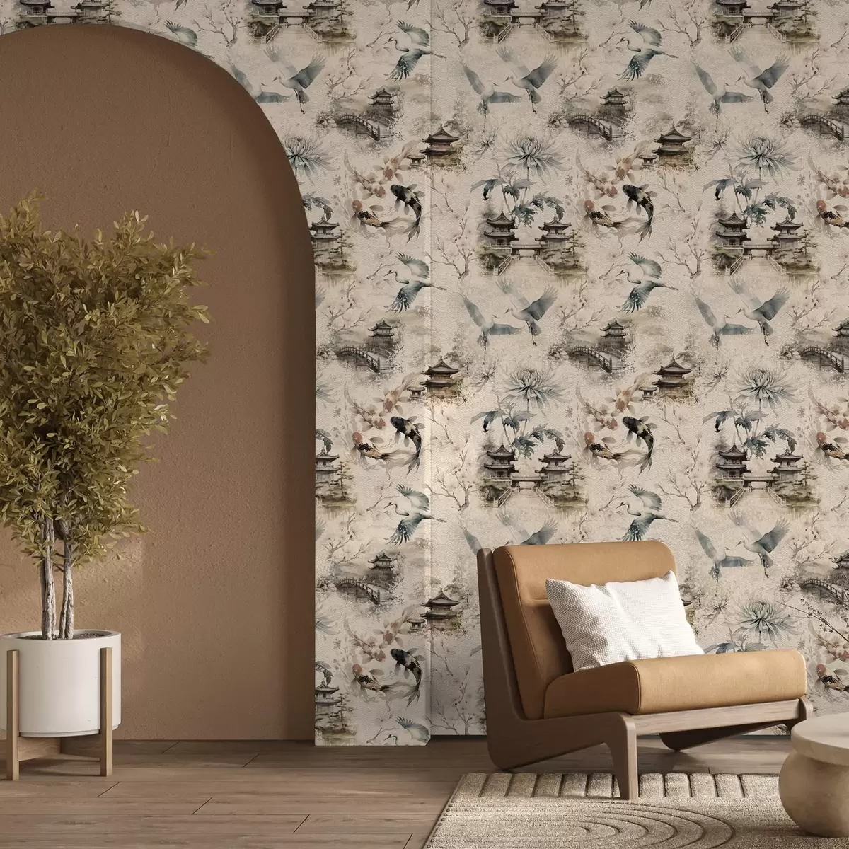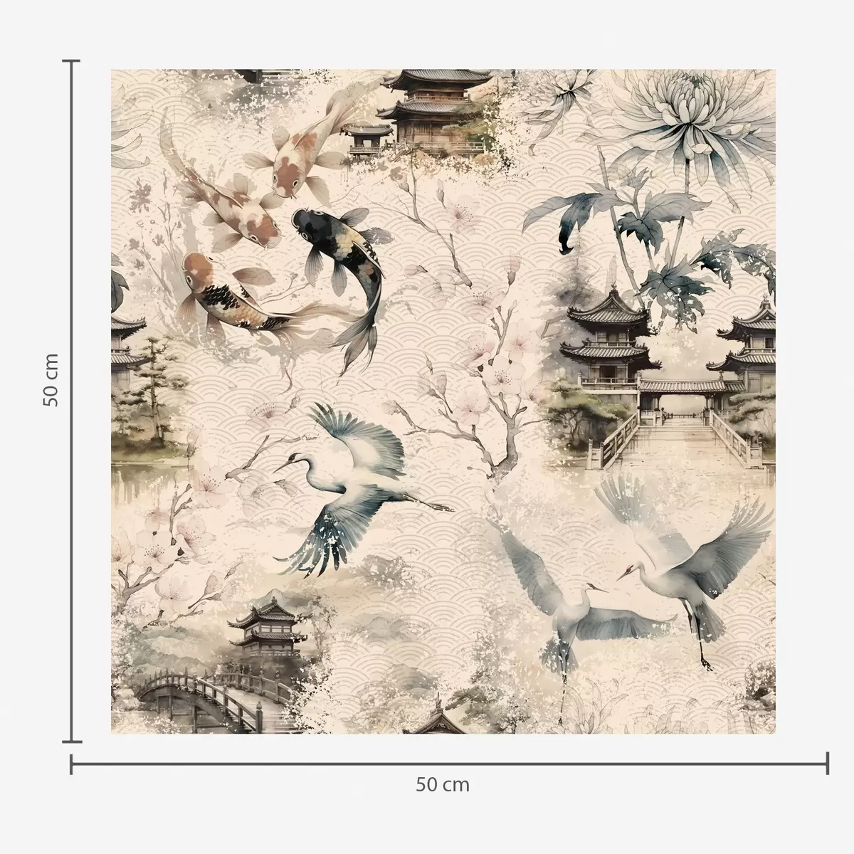 Тапет Японски храмове, кои риби и жерави на мек фон Nr. a01040