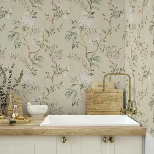 Тапет Деликатни клонки с цветя на топъл кремав фон Nr. a01084